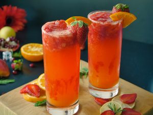 In a serving glass,add crushed ice,pureed strawberry (2-3 tbs),crushed strawberries (2-3 tbs),orange juice (1/4 Cup),7up & garnish with orange,strawberry & serve!