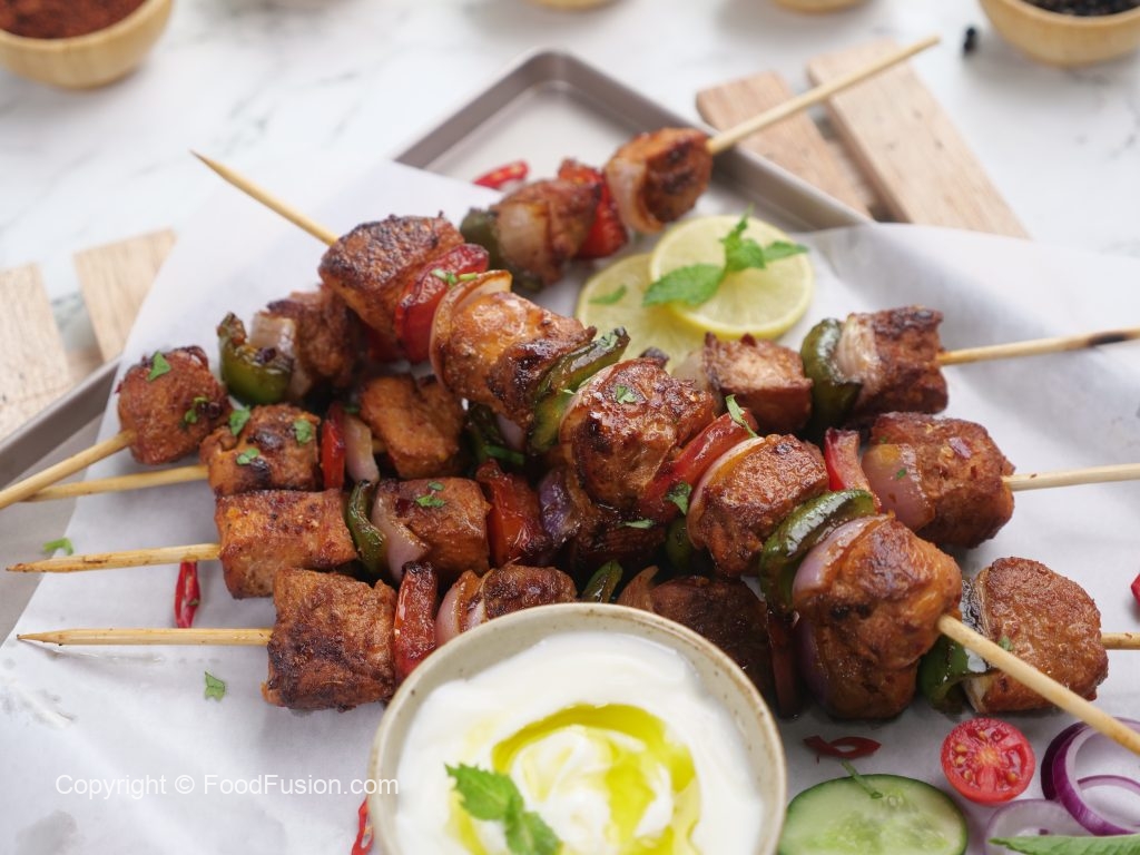 -Skew fiery chatkhara marinated chicken (thawed overnight) on wooden skewers along with onion,capsicum & tomato.