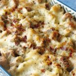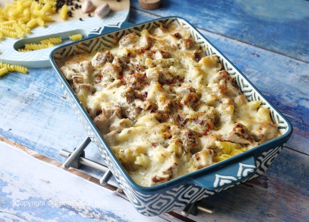 Grease baking dish with oil,add boiled spiral pasta,pour alfredo sauce,add chicken cubes and stir slightly.