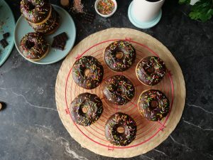 Doughnuts rakh dein,non-stick spray karein aur 150C per 4-5 minutes kliya bake ker lein.