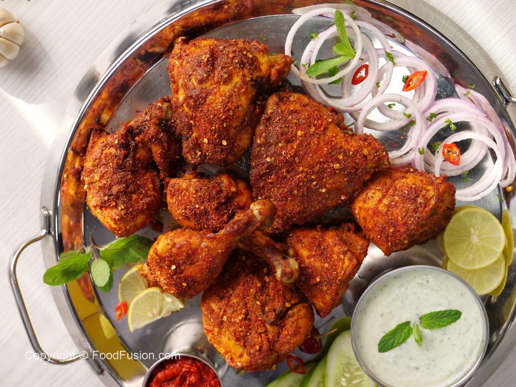 -Bowl mein dahi,adrak lehsan paste,zarda ka rang,cornflour,tayyar spice mix (reserve 1 & ½ tbs for later use),soy sauce,chilli sauce aur lemon juice dal ker ache tarhan mix ker lein.