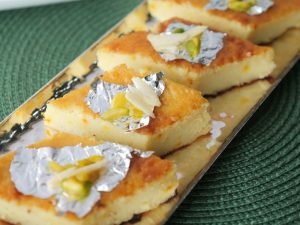 -Cut into diamond shape and garnish with silver leaves,pistachios,almonds & serve!