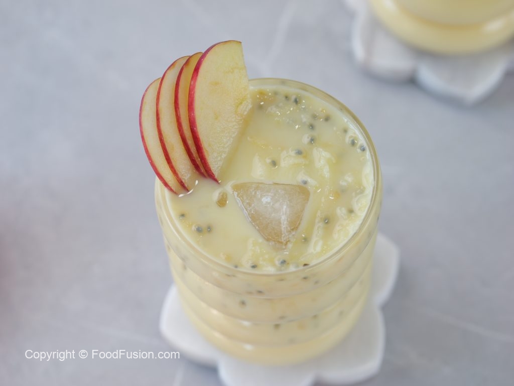 -In a large bowl,add ice cubes,milk,prepared sugar syrup,soaked basil seeds,apples (grate with the help of grater),mix well & serve!