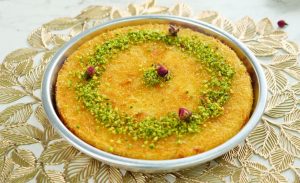 -Pour warm sugar syrup on hot kunafa & garnish with pistachios,rose buds & serve!