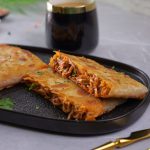 -Add 2 tbs of whisked eggs,onion,fresh coriander,green chilli,cheddar cheese slice & fold all sides of dough,apply whisked eggs & seal properly.