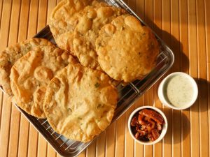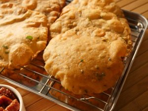 In wok,heat cooking oil and fry puri on medium low flame until golden brown.