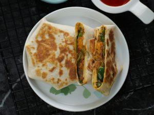 -Tortilla per salad patta,tayyar mayo & yogurt sauce,tayyar bbq chicken filling,mayo & yogurt sauce & cheese slice dal ker edges ko fold ker ka center ko cover ker lein.