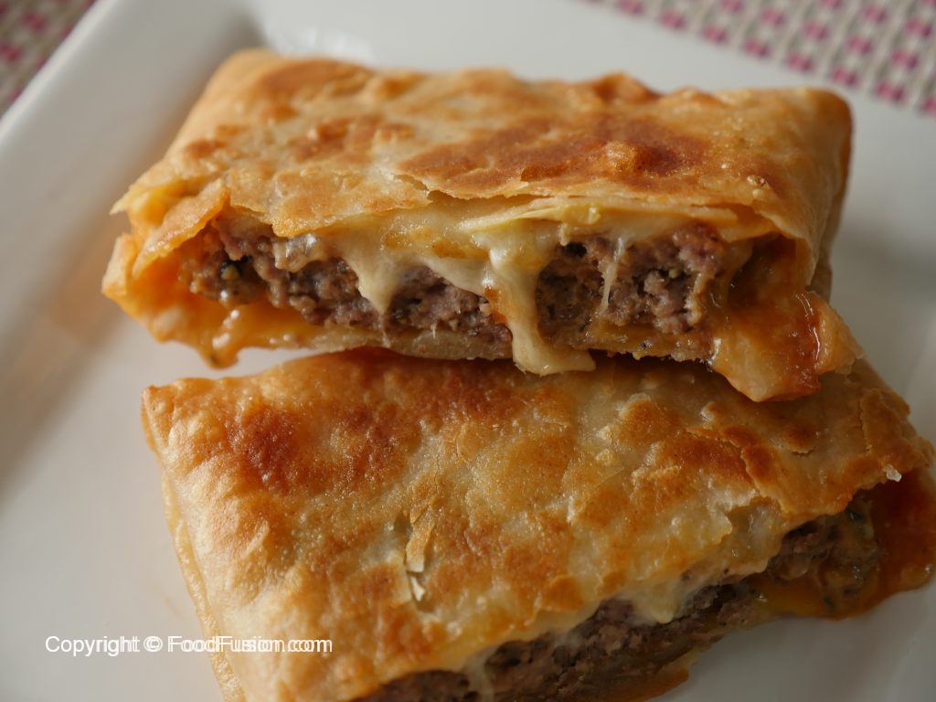 Place beef patty and fold all edges of flat bread (roti) and apply egg white to seal the edges.