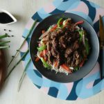 Serving dish mein cooked rice,stir fried vegetables,fried beef strips aur tayyar sauce drizzle ker ka serve karein!
