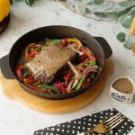 Stir fried vegetables aur beef steak rakh dein aur upper sa peppercorn sauce dal ker serve karein!