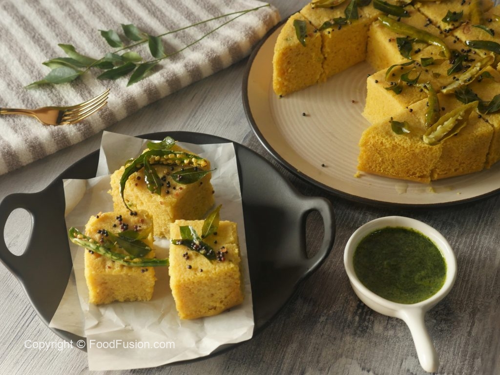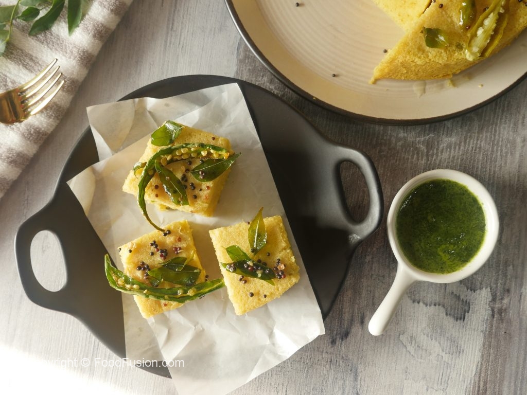 Cut into square pieces and pour tadka evenly on the dhoklas & serve!