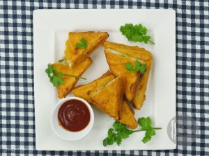 Stuffed bread slices ko triangular shape mein cut ker lein.