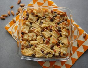 Add bread cubes,almonds,raisins,chocolate chips,prepared egg mixture,bread cubes,raisins,almonds, chocolate chip and prepared egg mixture.