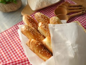 Knead dough again then divide dough into 14-15 strips (7 inches) and shape each into a uniform roll or long breadsticks.