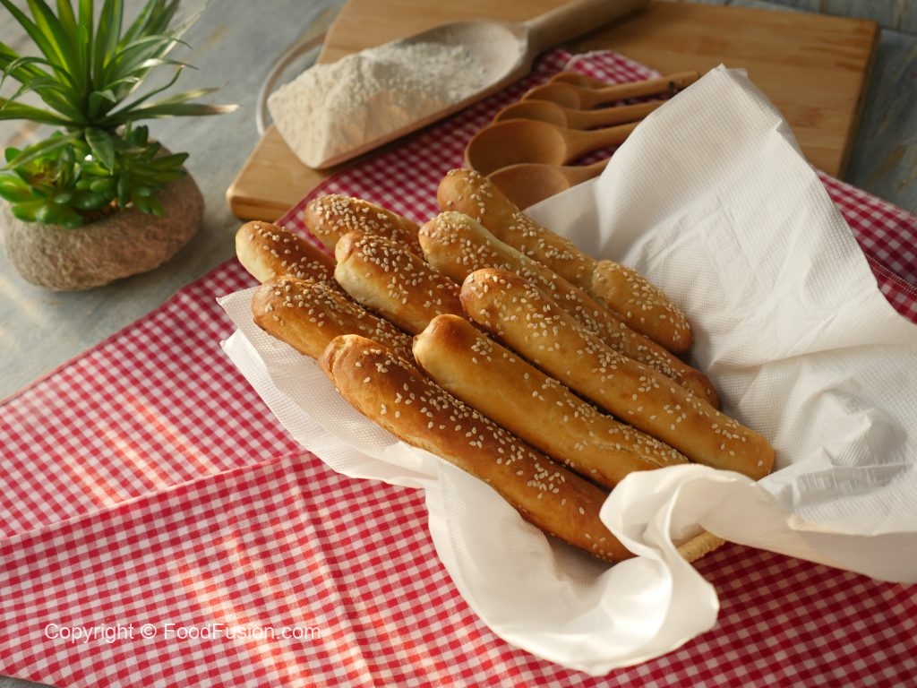 Brush breadsticks with egg white+water and sprinkle sesame seeds.