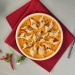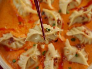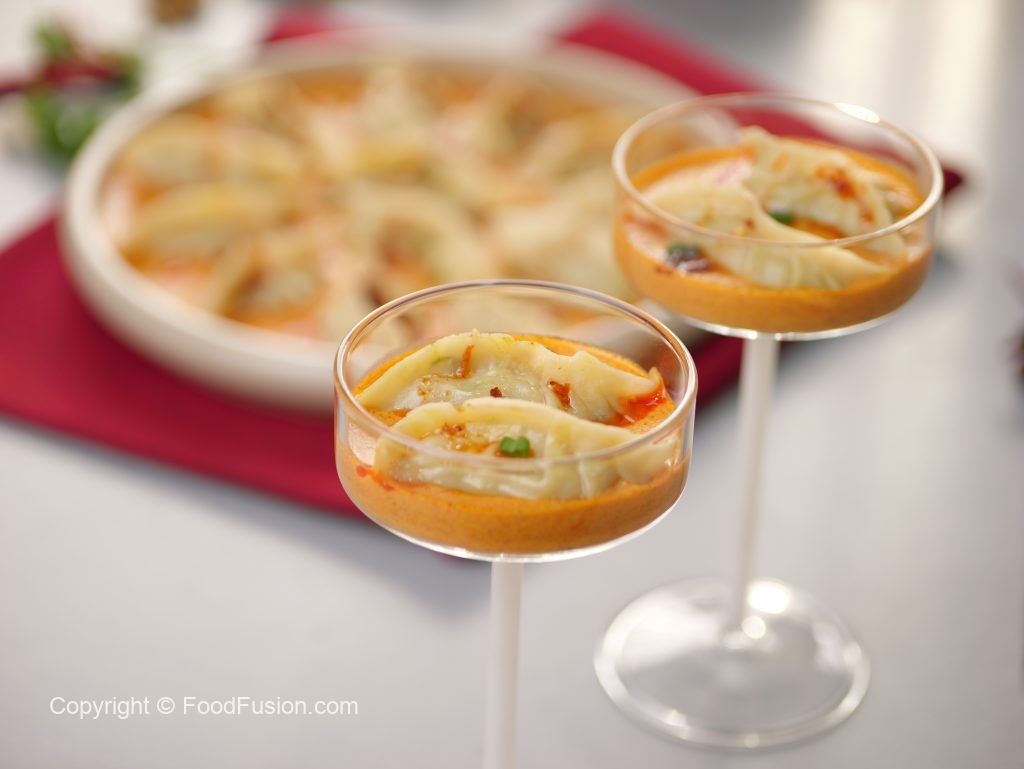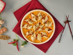 -On serving plate,pour prepared butter chicken sauce,place prepared dumplings,pour chilli oil,green onion leaves & serve!