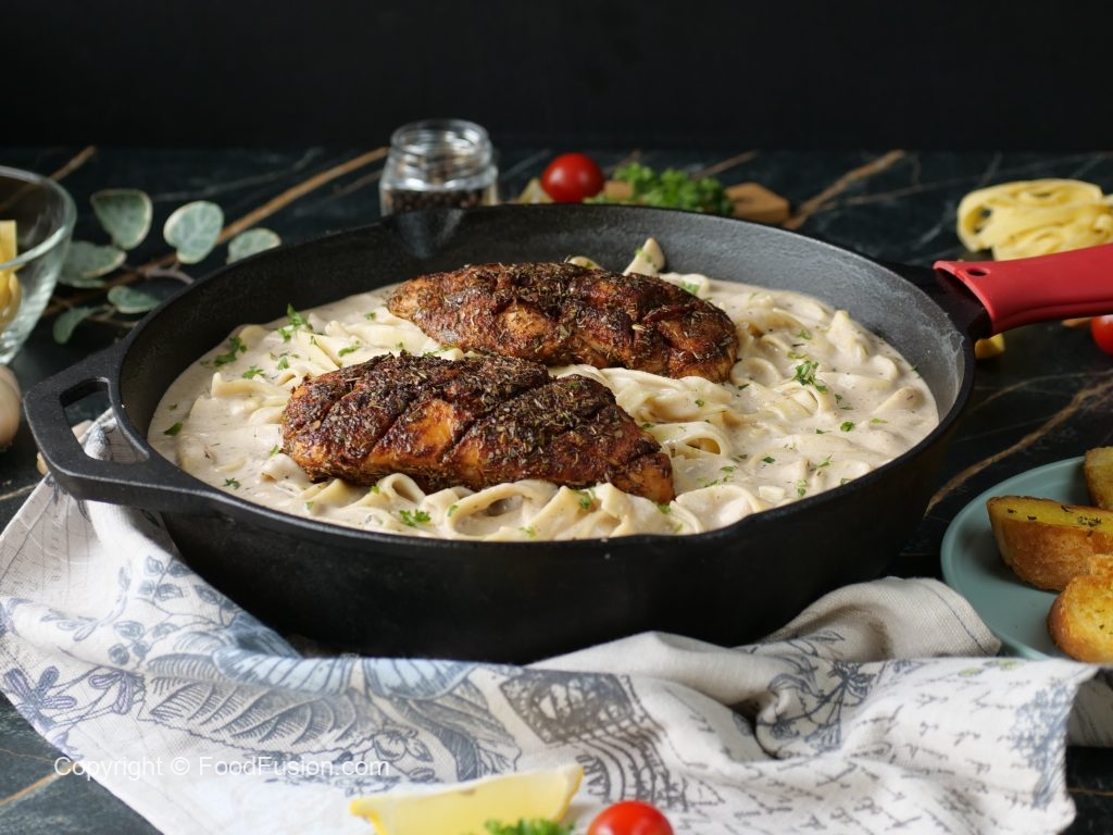 -Cast iron pan mein cooking oil dal dein aur chicken fillets ko halki ancch per dono sides sa paka lein (5-6 minutes each side) & side per rakh dein.