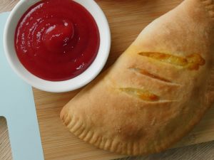 Baking dish per tayyar calzone rakh ker oil sa grease ker lein aur knife ki madad sa surface per marks laga lein (makes 4).