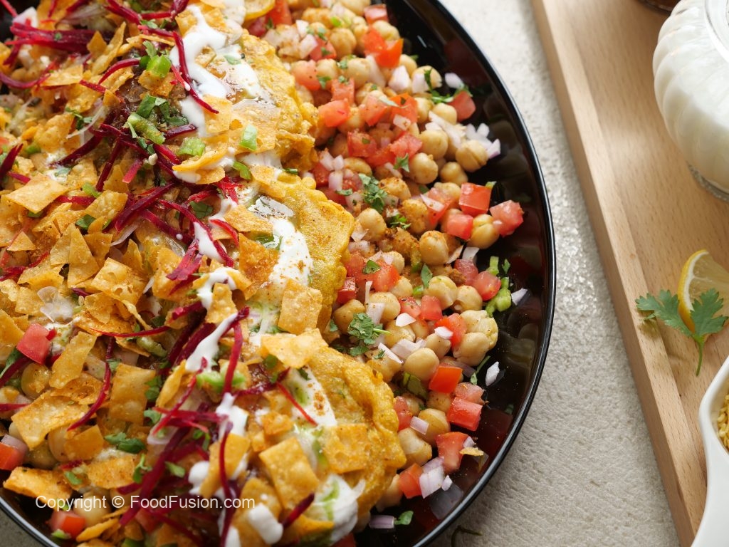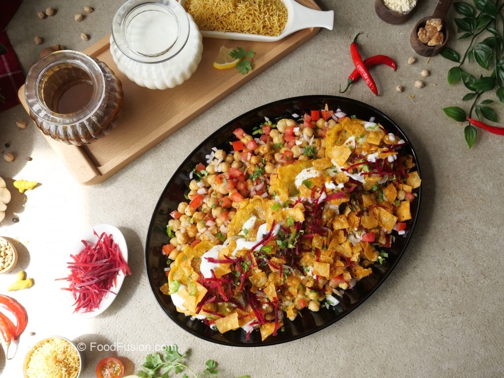 -In a serving platter,add chickpeas,tomato,onion,green chilli,chaat masala,fried potato chops, yogurt,green chutney,prepared imli ki khatti chutney,onion,prepared meethi khajoor chutney,papri, beetroot,green chilli,fresh coriander,chaat masala & serve!