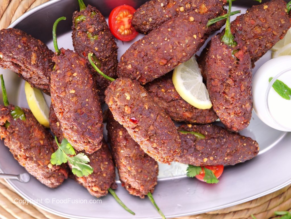-Chapli kabab mixture ki small quantity ko la ker palm per pheela lein,stuffed green chilli ko center mein rakh ker evenly coat ker lein.
