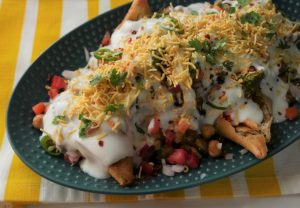 In serving dish,add fried samosa and crush slightly,add cooked chickpeas,onion,tomato,green chili,chaat masala,red chili crushed,lemon juice,green chutney,yogurt,nimco sev,fresh coriander,red chili crushed & serve!