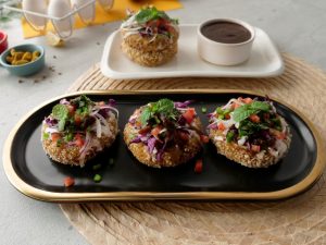 Now dip aalo tikki in whisked eggs then coat with breadcrumbs (makes 9-10).
