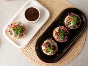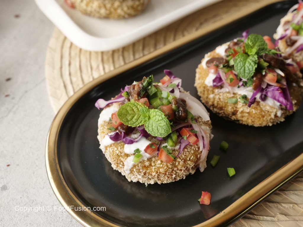 Aalo tikki per dahi,band gobhi,pyaz,shimla mirch,tamatar,hara dhania aur tayyar chutney dal dein.