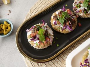 On aalo tikki,add yogurt,cabbage,onion,capsicum,tomato,fresh coriander & prepared chutney.