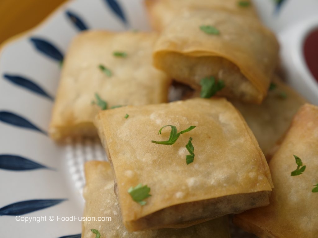 Samosa sheet/manda patti ko four equal parts/strips mein cut ker lein,ek samosa patti ko horizontal rakh dein,maida ki slurry laga phir us ka upper dosri samosa patti vertical rakh dein,plus (+) ka sign bun jaye.
