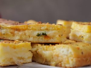 -Tayyar garlic butter aur cheese sauce dal ker pheela lein,mozzarella cheese dal ker upper sa ek aur bread ki side rakh dein.
