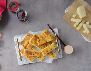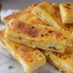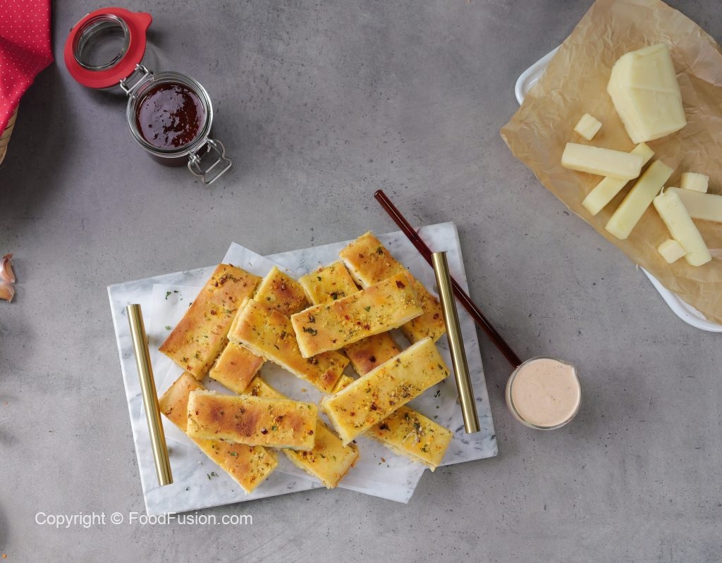 -Tayyar garlic butter laga ker sticks mein cut ker lein.