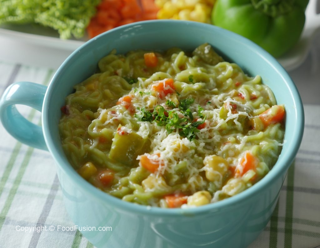 Shimla mirch,kernel corns,green noodles cake,taste maker,soy sauce,lal mirch crushed,namak aur cheddar cheese dal ker ache tarhan mix karein.