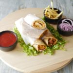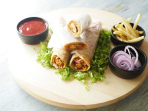 Paratha per tomato ketchup,pyaz soaked in lemon juice aur cooked chicken dal ker wrap ker lein & serve karein.