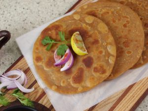 -Heat griddle & fry paratha with clarified butter on medium flame from both sides until golden (makes 9).