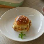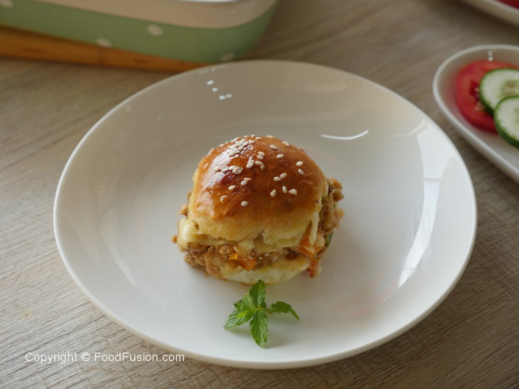 In baking dish,place burger buns,add tomato ketchup,cheddar cheese,cooked chicken mixture,pickled cucumber,onion slices,mozzarella cheese slices and cover with top buns.