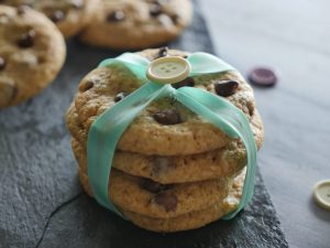 Grease baking tray with oil,take a mixture and make a ball,place it over the baking tray and slightly press it and add chocolate chips.
