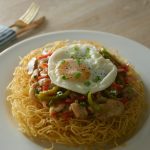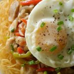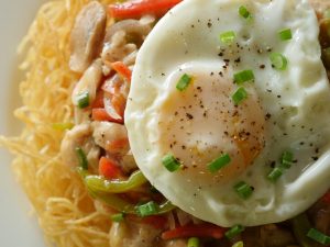 On serving place,place crispy fried noodles,chicken with sauce,fried egg,black pepper crushed,green onion & serve.