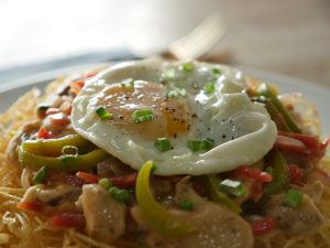 Serving plate mein crispy fried noodles rakh dein aur chicken with sauce,fried anda,kali mirch crushed aur hara pyaz dal ker serve karein.