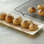 On baking plate/tray,place butter paper and nan khatai balls,egg yolk wash and add instant coffee & sugar on top.