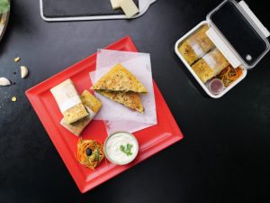 -Add butter,garlic,red chilli crushed,flip the sandwich & cook other side until golden & crispy (makes 4).