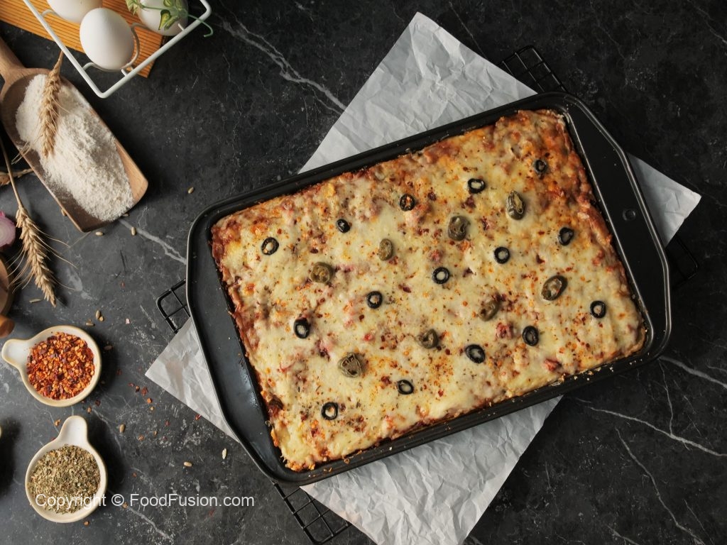 9x12 inch baking tray ko cooking oil sa grease karein aur liquid dough ki half quantity dal ker evenly pheela lein aur few times tap karein.