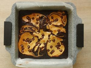 8 x 8 inch baking pan mein butter paper laga lein,tayyar brownie batter aur cream cheese batter dal dein aur skewer ki madad sa swirls bana lein.