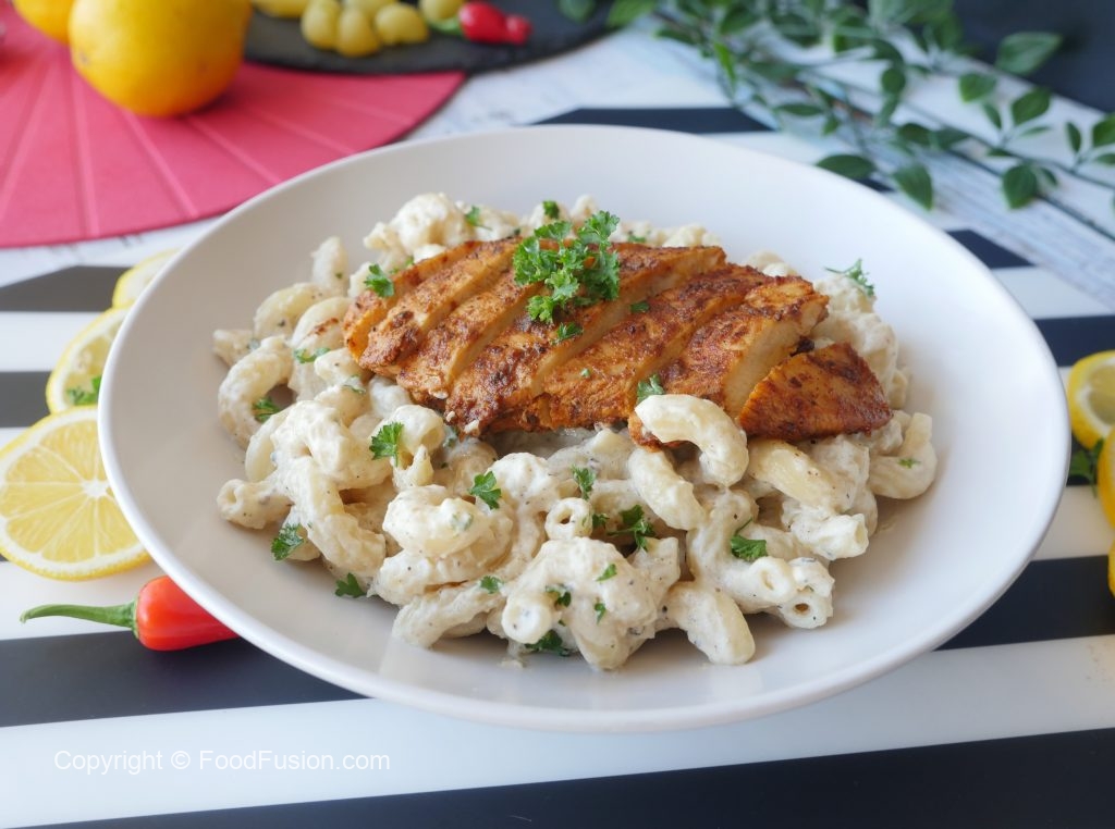 Serving plate mein pasta dal ker grilled chicken rakh dein aur fresh parsley sa garnish ker ka serve karein!