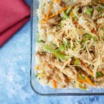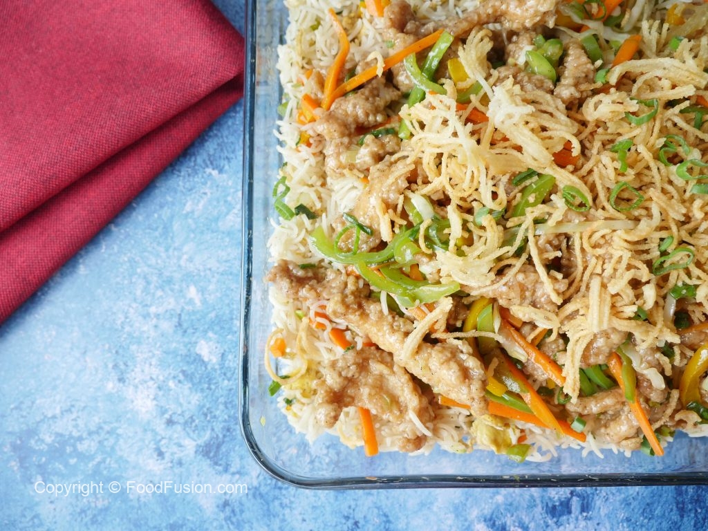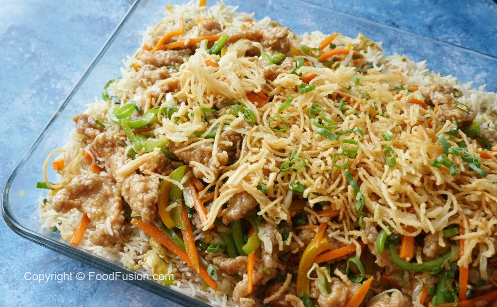 Serving dish mein fried rice,crispy fried chicken with vegetables aur fried egg noodles,hara pyaz ka leaves dal ker serve karein.