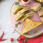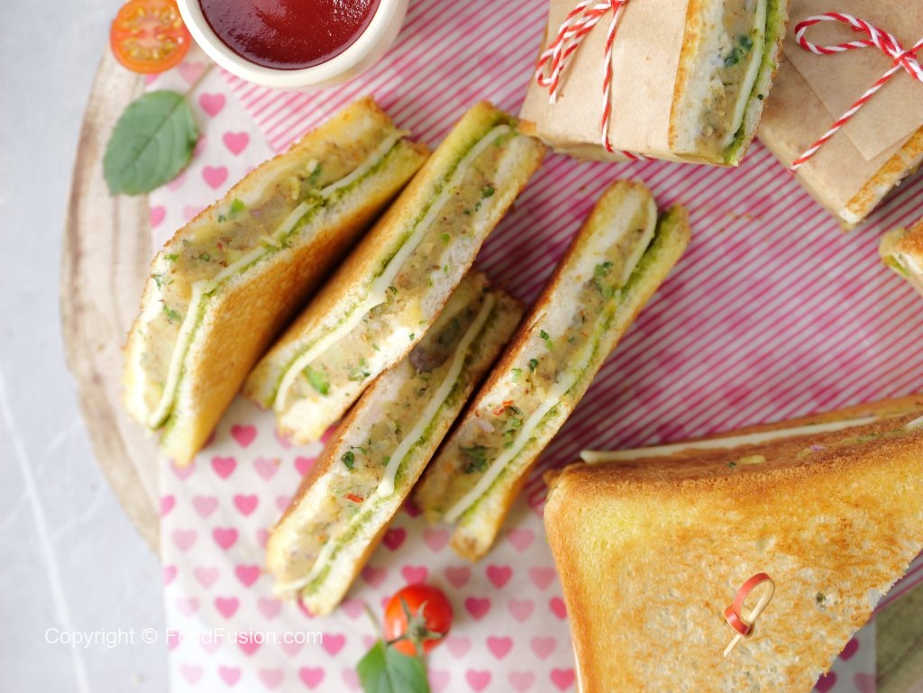 -Place cheddar cheese slices (cut into triangles) & spread prepared green chutney on another bread slice & flip it to make a sandwich.
