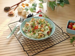 -Spray cooking oil & air fry at 170°C until potatoes are crispy (18-20 minutes),turn sides in between & set aside.