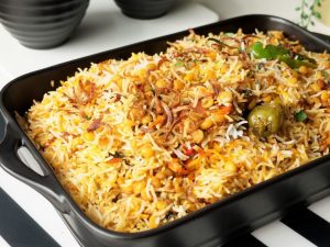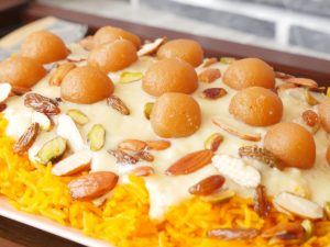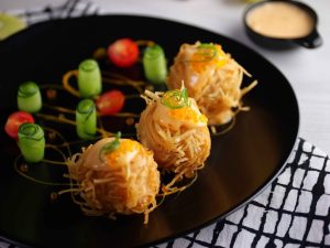 -Garnish karen bang bang sauce, caviar, green onion, cucumber aur cherry tomato ke saath.