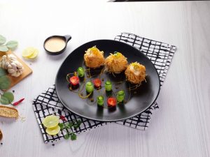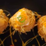 -Garnish with bang bang sauce,caviar,green onion,cucumber & cherry tomato.
