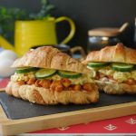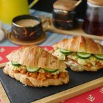 Add prepared mayo sauce,chicken tikka cubes,cheese slices,prepared scrambled eggs,cucumber slices & croissant on top (makes 3-4).