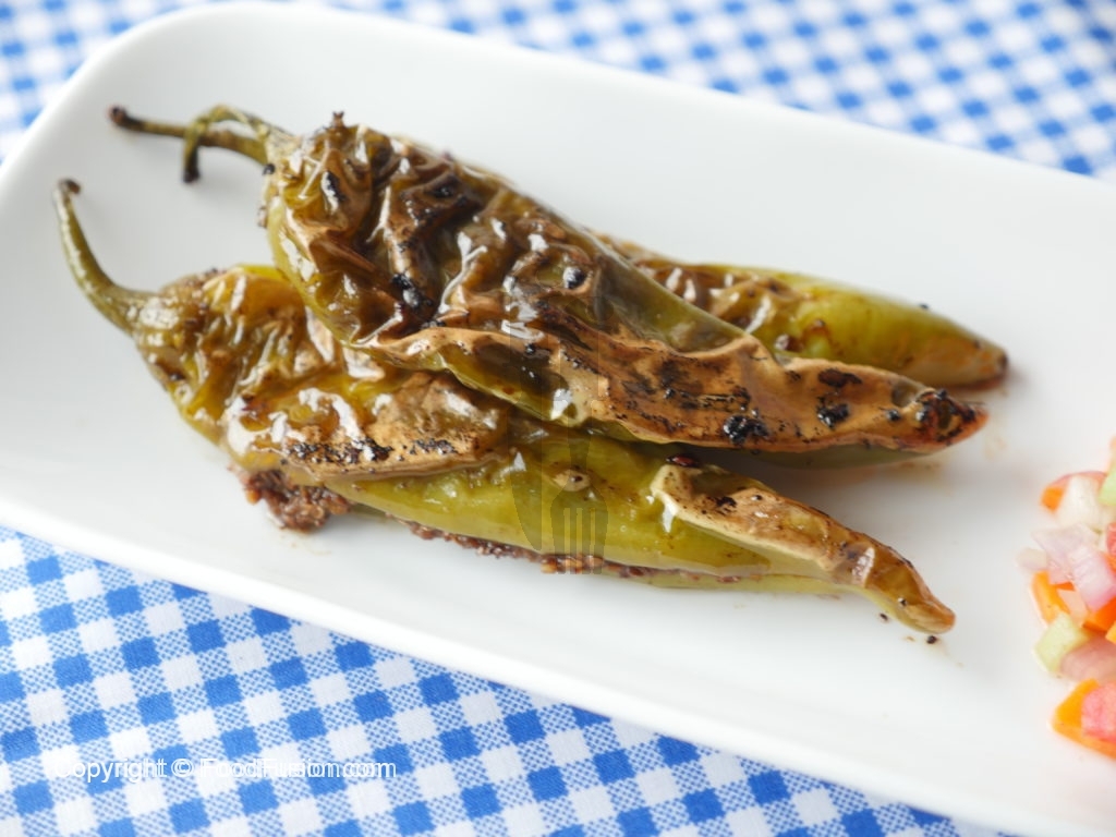 In frying pan,add oil and stuffed green chilies,cover and fry from both sides until done.